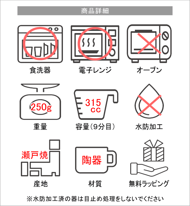 材質 陶器 容量(9分目) 315cc 重量 250g 生産国 日本(瀬戸) ※陶器の裏面は多少ざらざらとしているため、テーブル等の擦り傷にご注意ください 備考 ・北海道・沖縄・離島の送料はお問い合わせ下さい ・ディスプレイによる色の違いは予めご了承下さい ・手作り品のため僅かな寸法違いは予めご了承下さい |