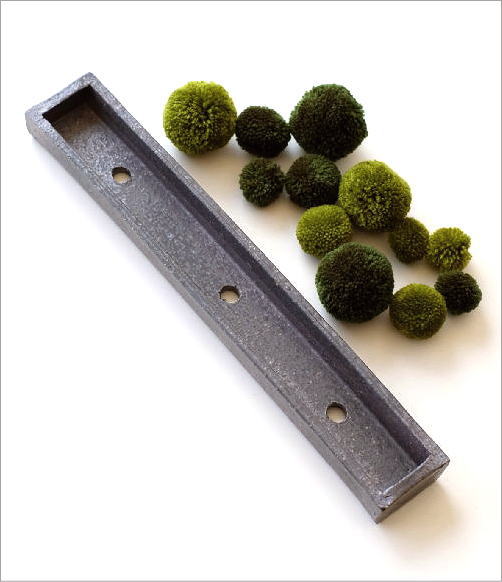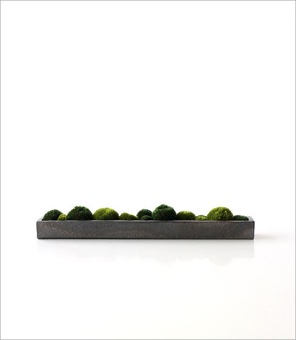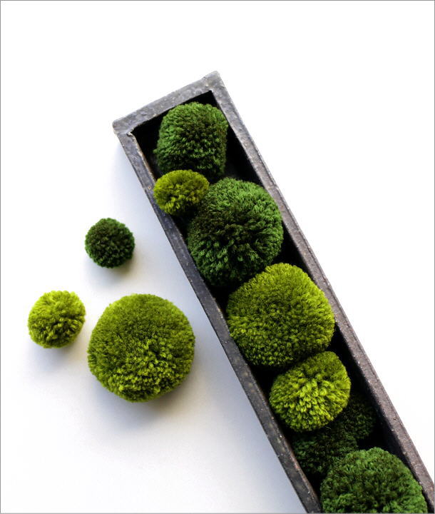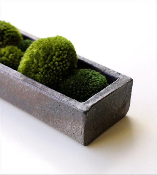 信楽焼の花器にコロコロと並ぶ毛糸の苔玉が可愛い