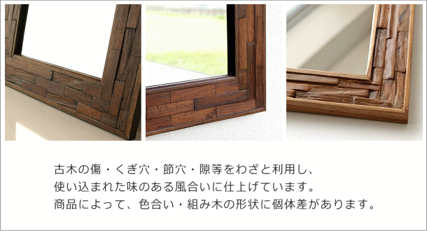 材質 天然木 ミラー 重量 約2kg 生産国 タイ ※商品の特性上、ミラーに僅かな擦り傷等が見られる場合があり、本体は天然木使用のためそれぞれ個体差があります。予めご了承下さい。 ※壁の強度をお確かめの上しっかりとお取り付けください。 備考 ・北海道・沖縄・離島の送料はお問い合わせ下さい ・ディスプレイによる色の違いは予めご了承下さい ・手作り品の為僅かな寸法違いは予めご了承下さい |