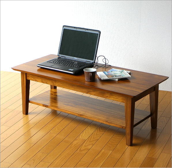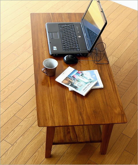 天板のスタイリッシュな鋭角がちょっといいデザイン、100%チーク無垢材の質感もいい感じのシンプルなセンターテーブルです。テーブルとしてもデスクとしてもカッコよく使えそう。下にある収納スペースの棚には雑誌や新聞といった収納に便利ですし収納スタイルもカッコよく決まりますよ。